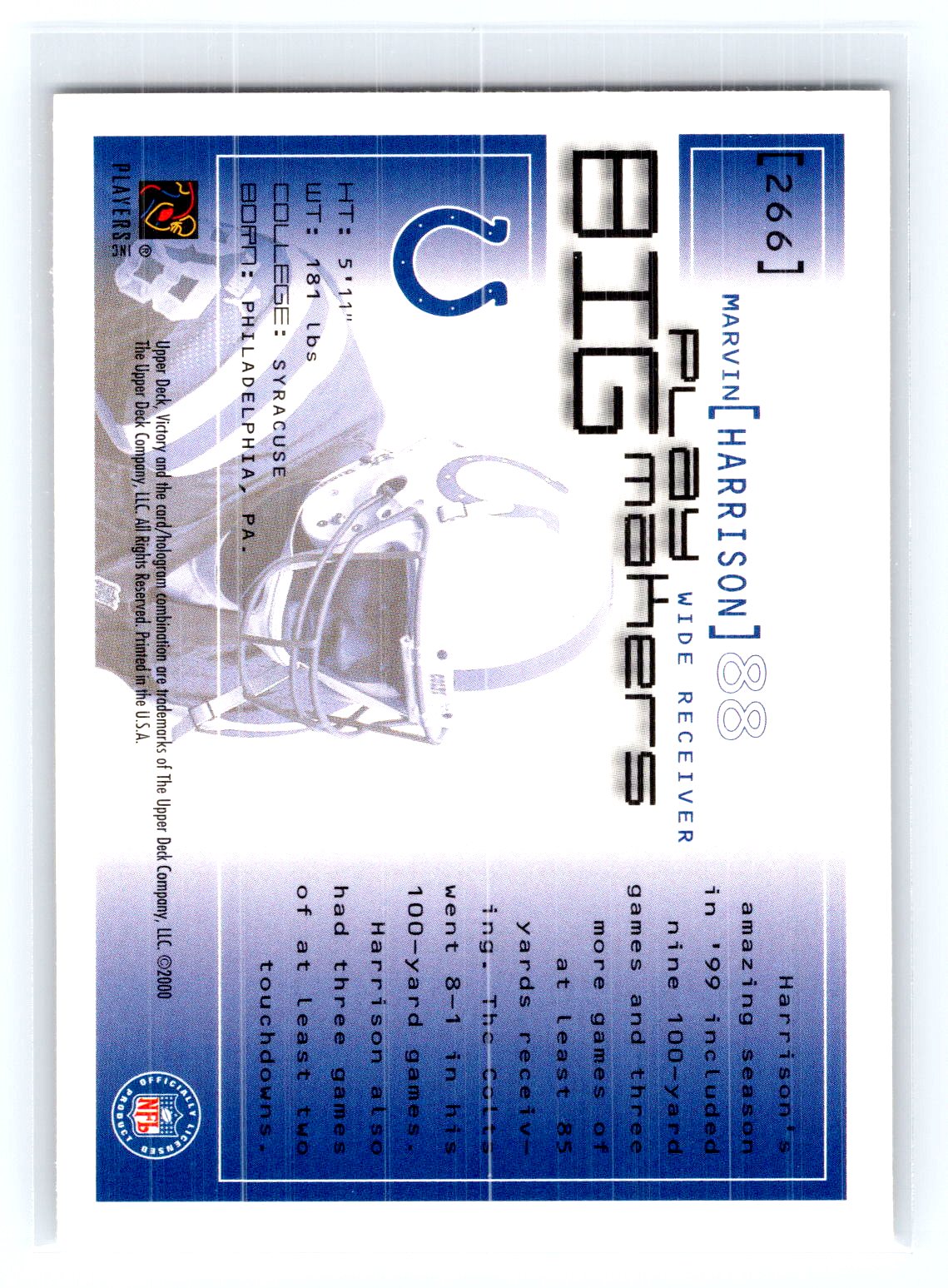This is a really nice example of a 2000 Upper Deck Victory #266 Marvin Harrison .