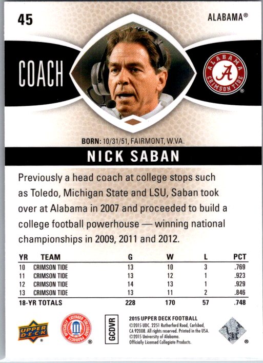 This is a really nice example of a 2015 Upper Deck #45 Nick Saban .