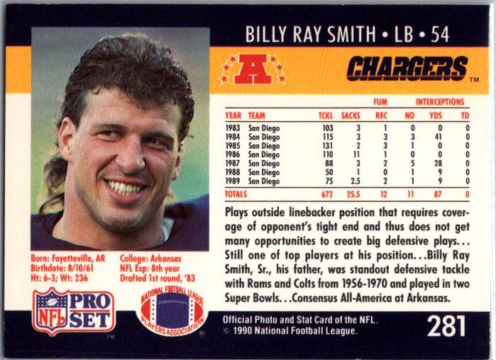 In 1990 Billy Ray Smith played for the San Diego Chargers.