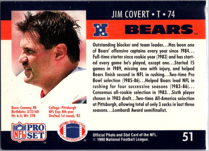 This is a really nice example of a 1990 Pro Set #51 Jim Covert .