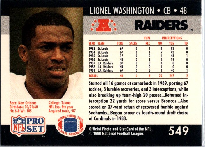 In 1990 Lionel Washington played for the Los Angeles Raiders.