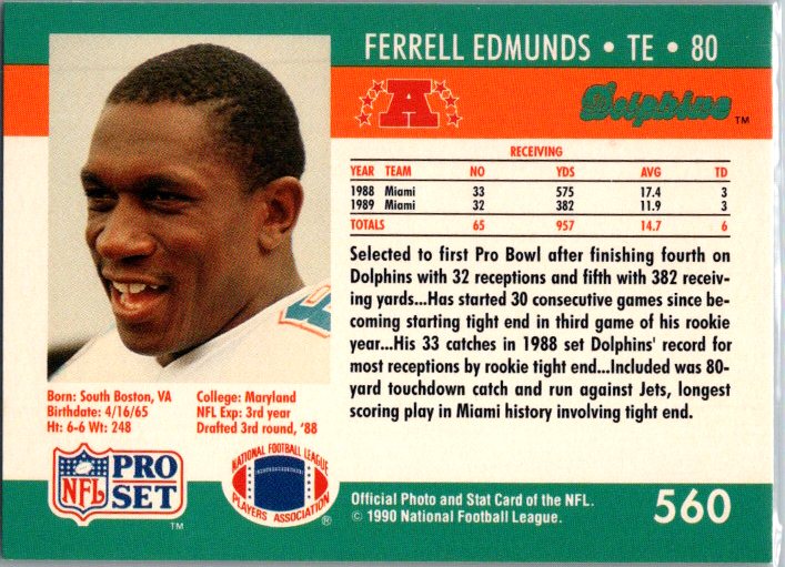 This is a really nice example of a 1990 Pro Set #560 Ferrell Edmunds .