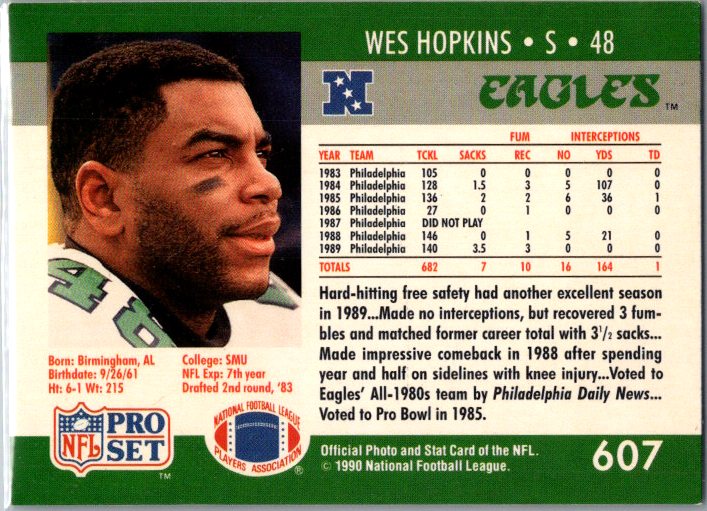 This is a really nice example of a 1990 Pro Set #607b Wes Hopkins .