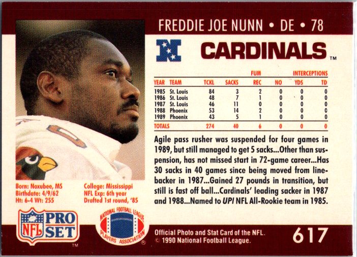 This is a really nice example of a 1990 Pro Set #617 Freddie Joe Nunn .