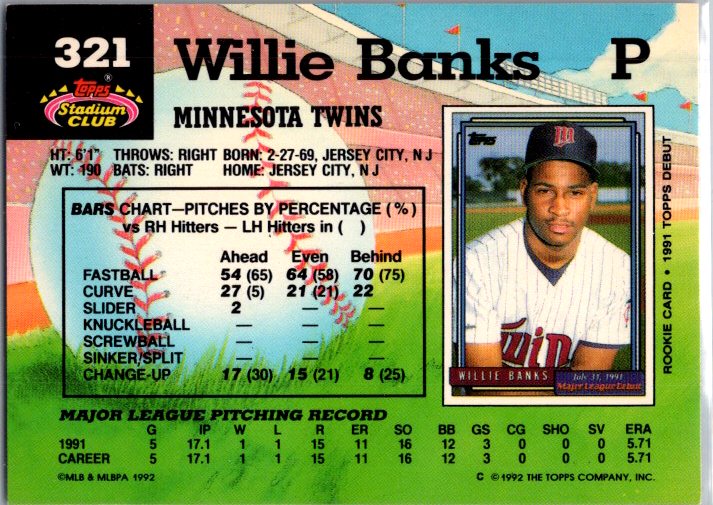 This is a really nice example of a 1992 Stadium Club #321 Willie Banks .