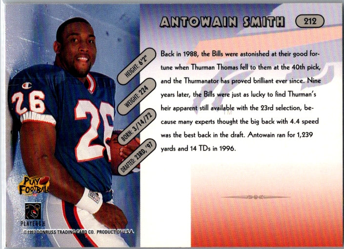 This is a really nice example of a 1997 Donruss #212 Antowain Smith .