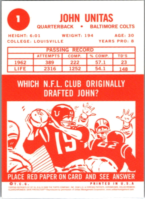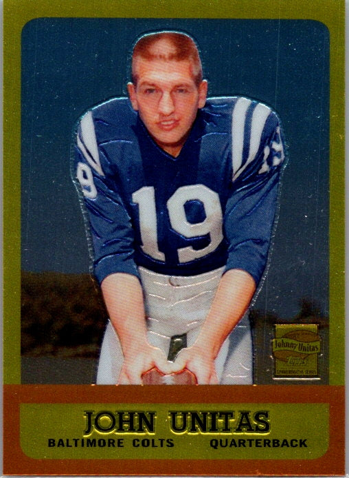 This is a really nice example of a 2000 Topps Chrome #R7 Johnny Unitas Johnny Unitas Reprints.