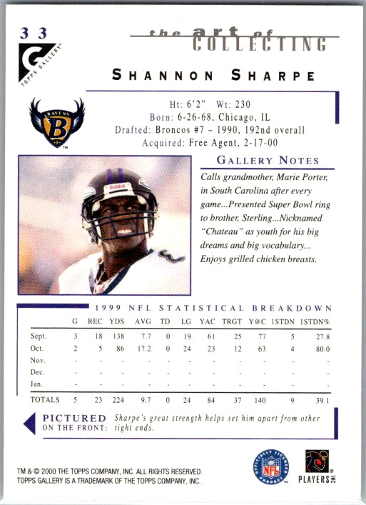 This is a really nice example of a 2000 Topps Gallery #33 Shannon Sharpe .