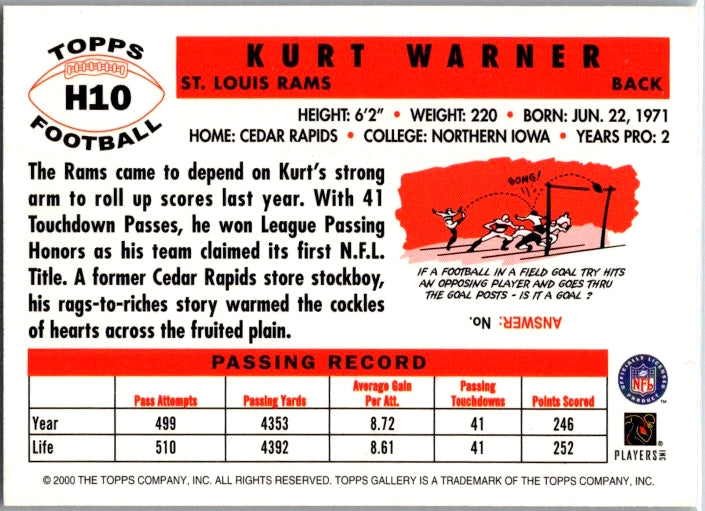 This is a really nice example of a 2000 Topps Gallery #H10 Kurt Warner Heritage.