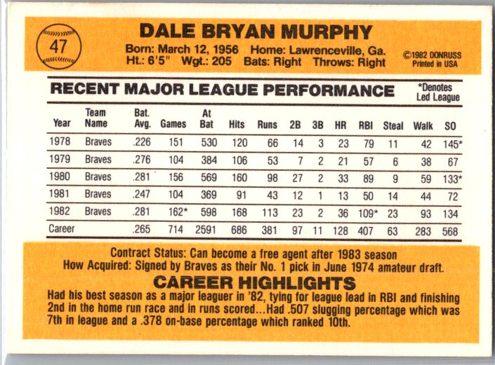 This is a really nice example of a 1983 Donruss #47 Dale Murphy .