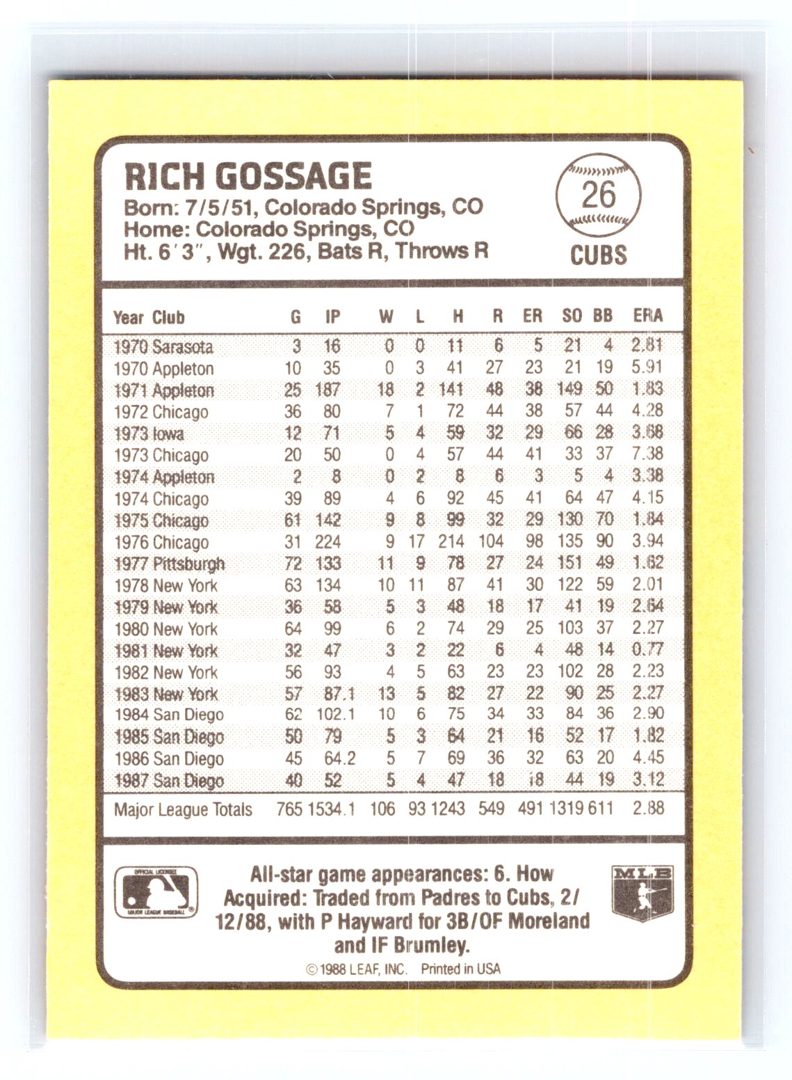 In 1988 Rich Gossage played for the Chicago Cubs.