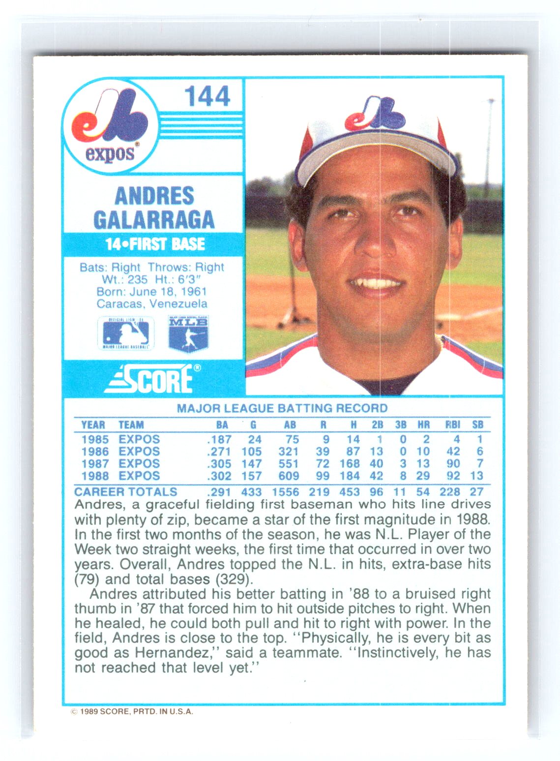 This is a really nice example of a 1989 Score #144 Andres Galarraga .
