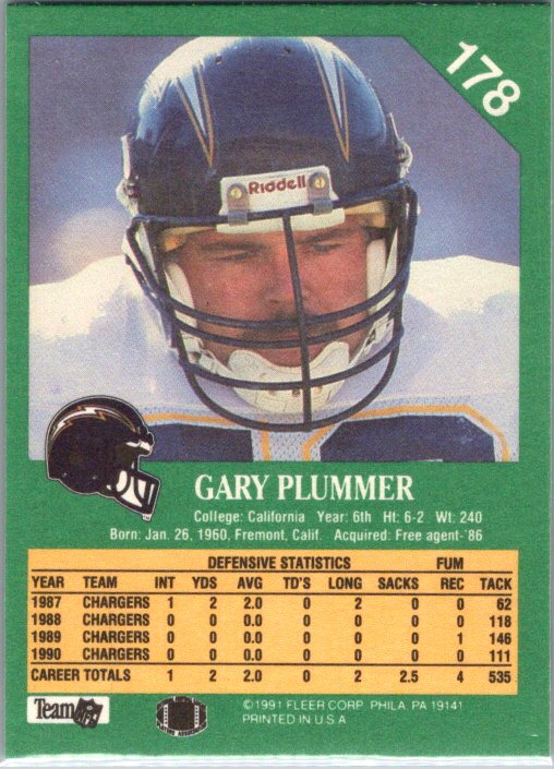 In 1991 Gary Plummer played for the San Diego Chargers.