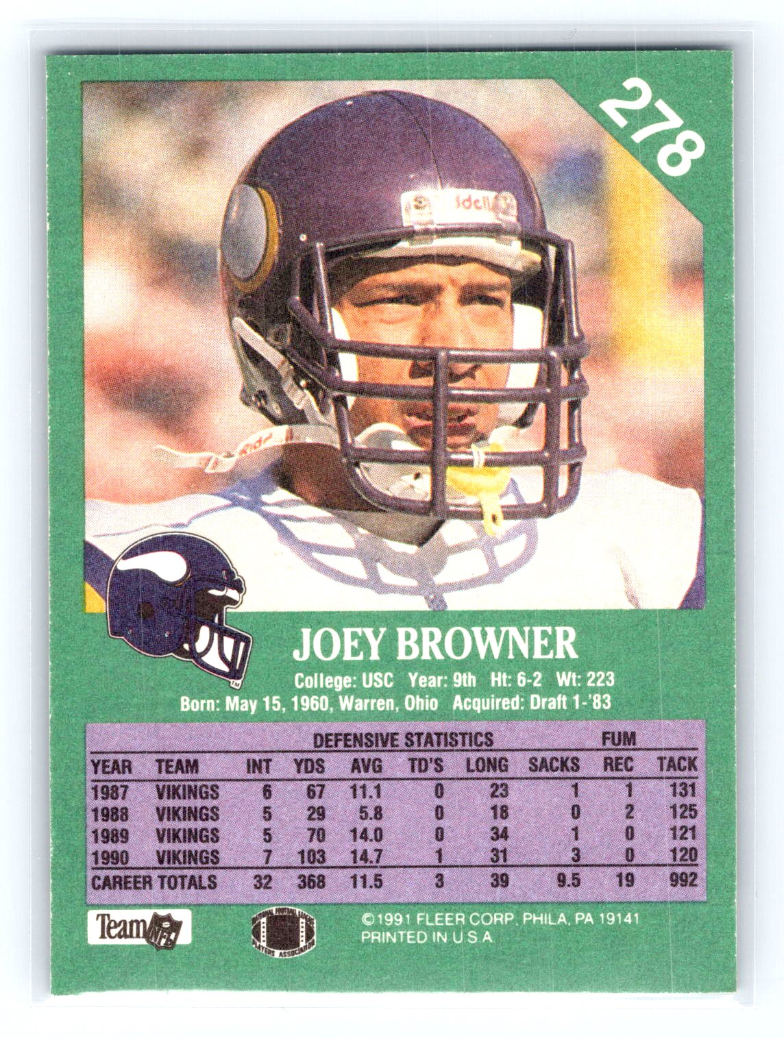 This is a really nice example of a 1991 Fleer #278 Joey Browner .