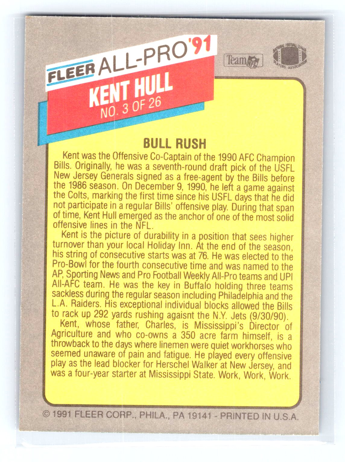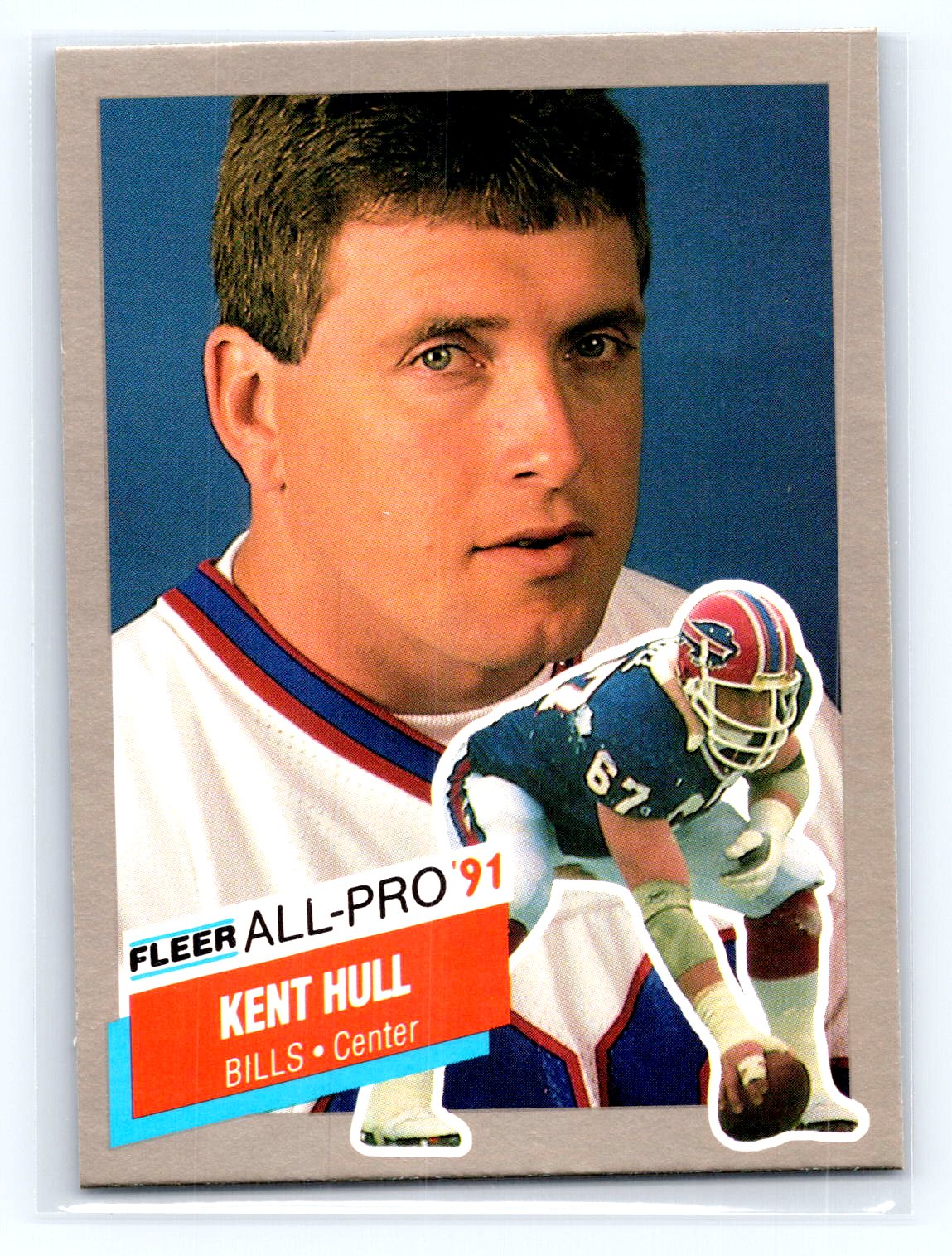 This is a really nice example of a 1991 Fleer #3 Kent Hull All-Pro '91.