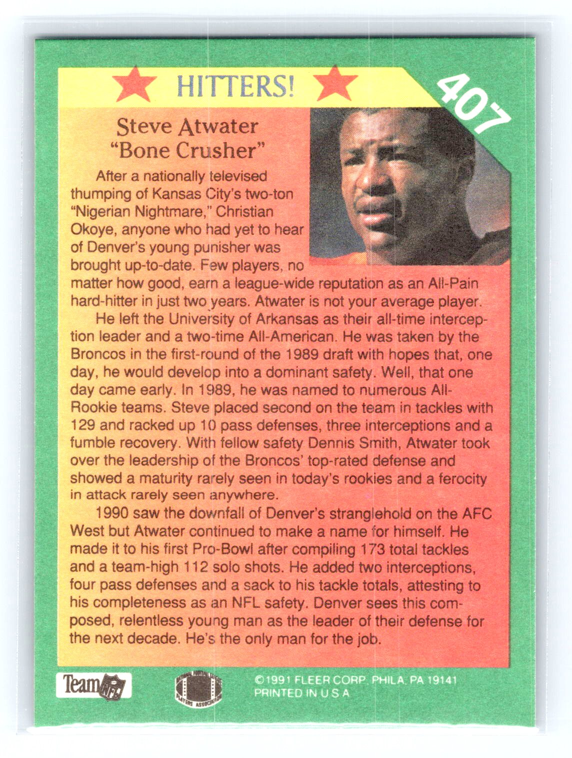 This is a really nice example of a 1991 Fleer #407 Steve Atwater .