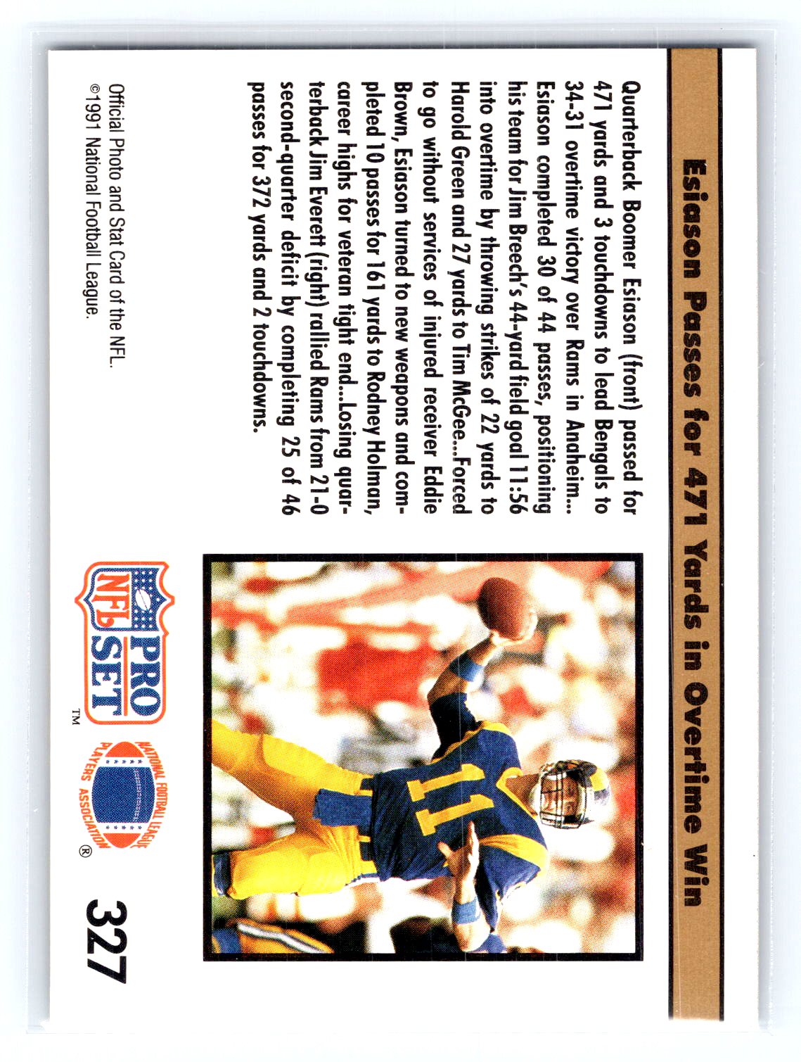 This is a really nice example of a 1991 Pro Set #327 Bengals Lower Boomer .