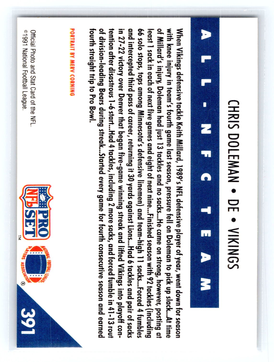 This is a really nice example of a 1991 Pro Set #391 Chris Doleman .