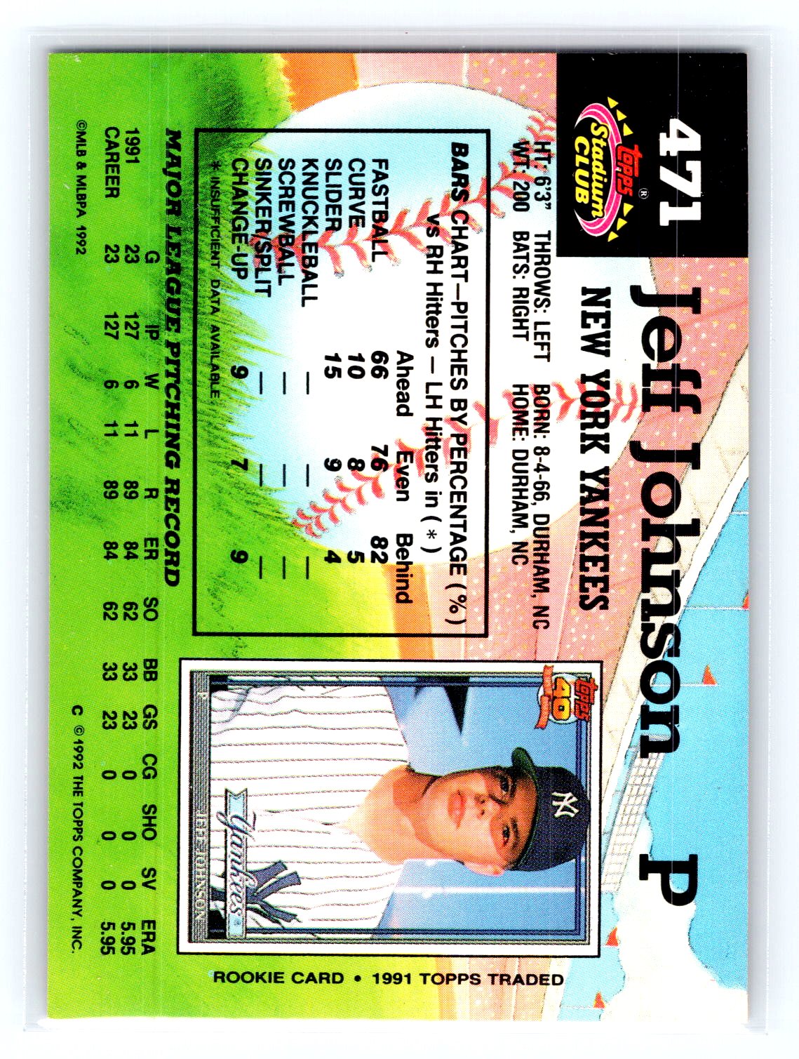 This is a really nice example of a 1992 Stadium Club #471b Jeff Johnson .
