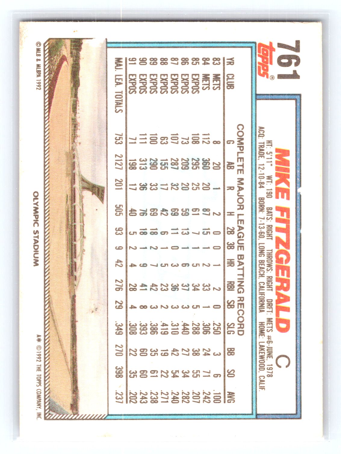 This is a really nice example of a 1992 Topps #761 Mike Fitzgerald .