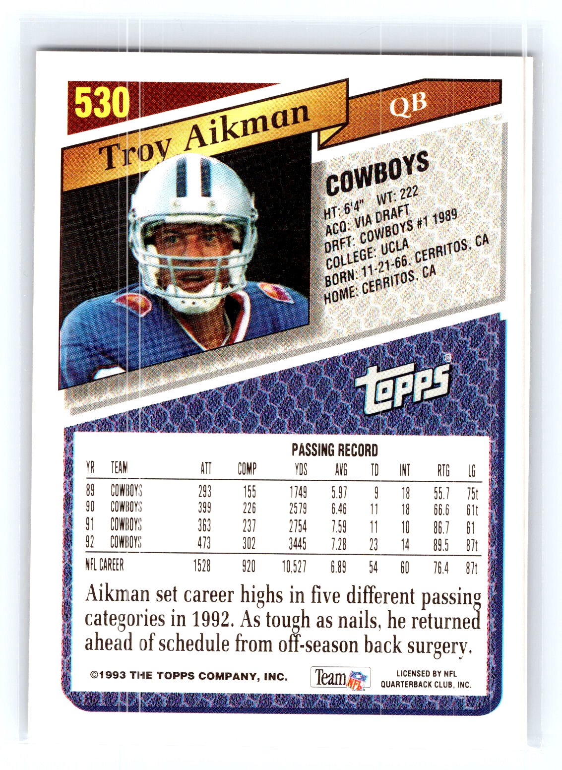 This is a really nice example of a 1993 Topps #530 Troy Aikman .