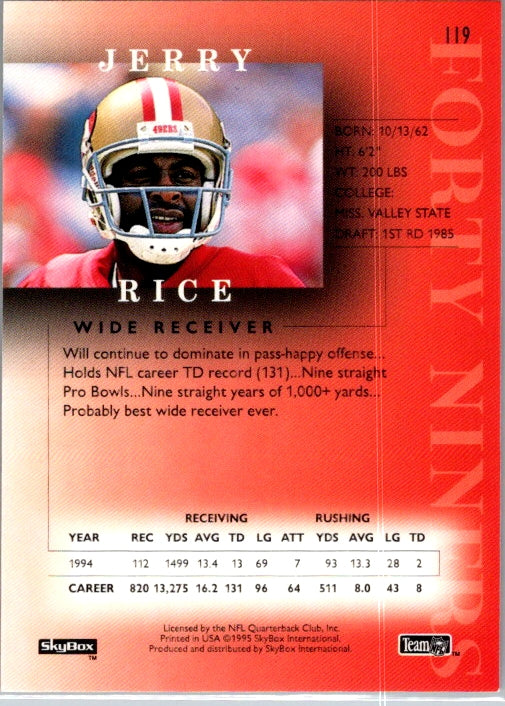 This is a really nice example of a 1995 SkyBox Premium #119 Jerry Rice .