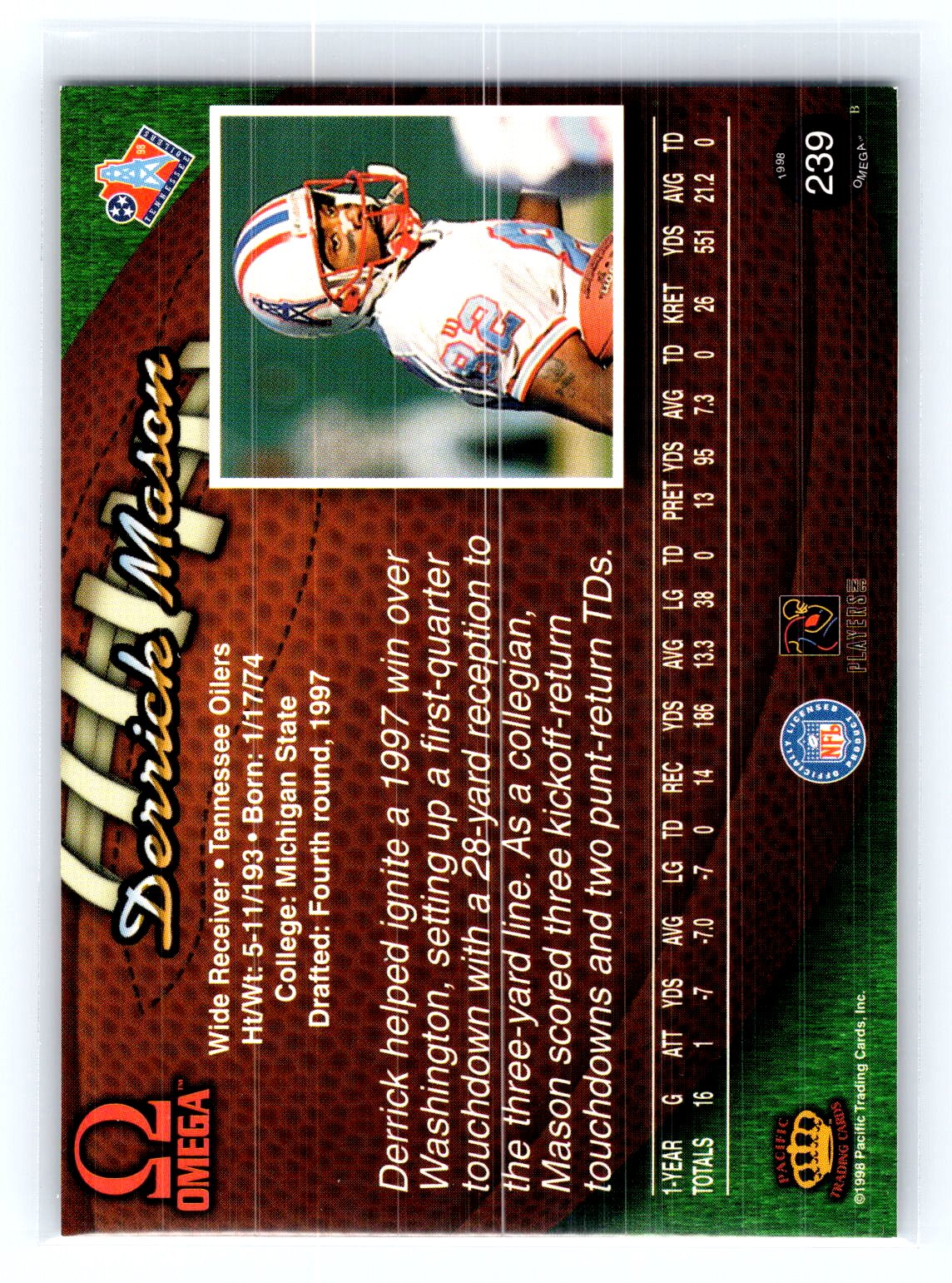 This is a really nice example of a 1998 Pacific Omega #239 Derrick Mason .