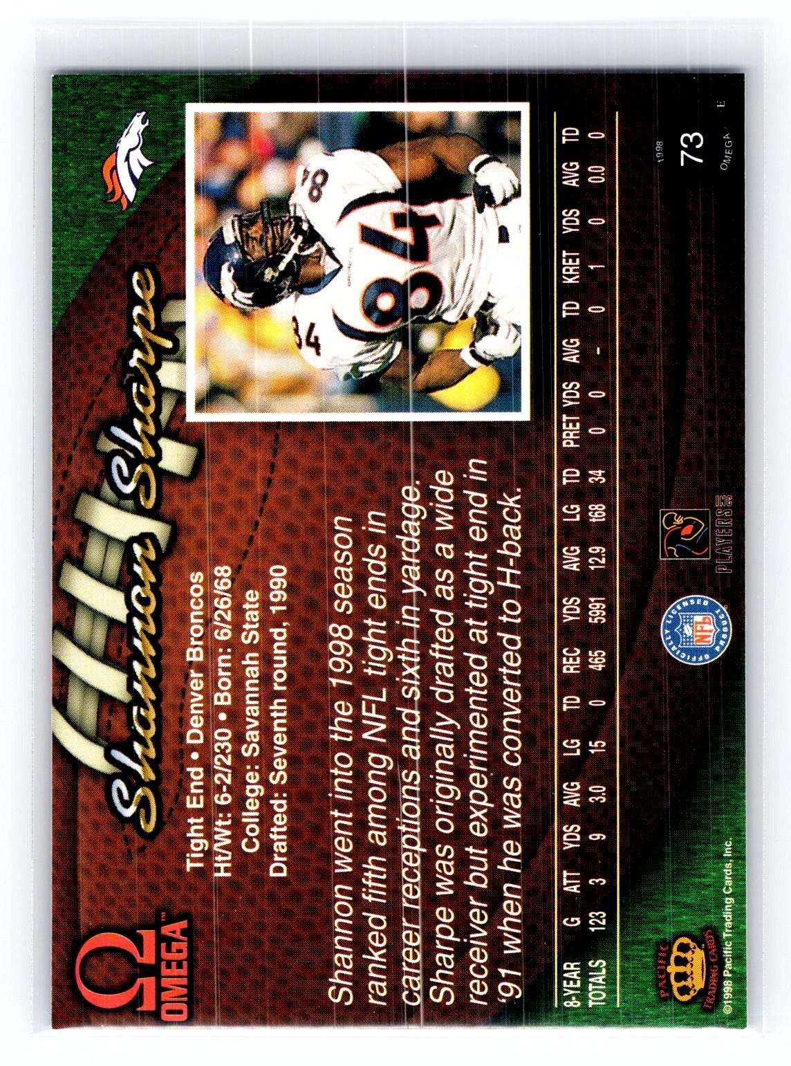 This is a really nice example of a 1998 Pacific Omega #73 Shannon Sharpe .