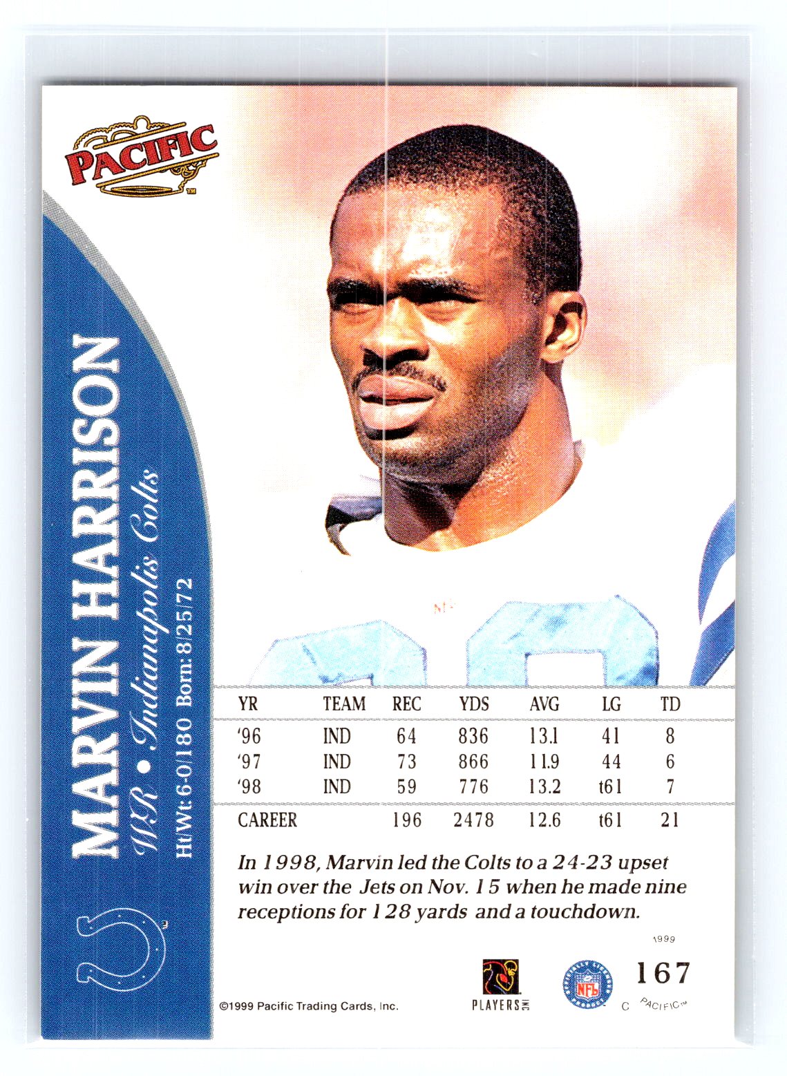 This is a really nice example of a 1999 Pacific #167 Marvin Harrison .