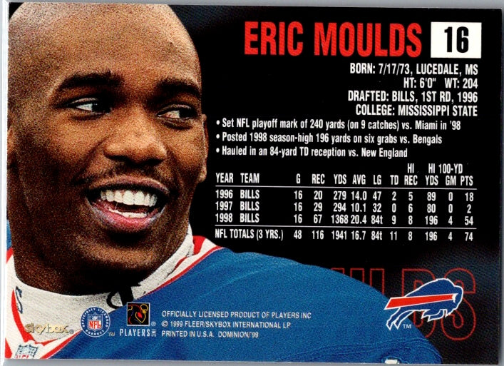 This is a really nice example of a 1999 SkyBox Dominion #16 Eric Moulds .