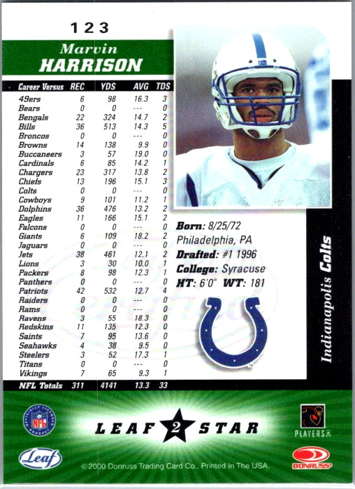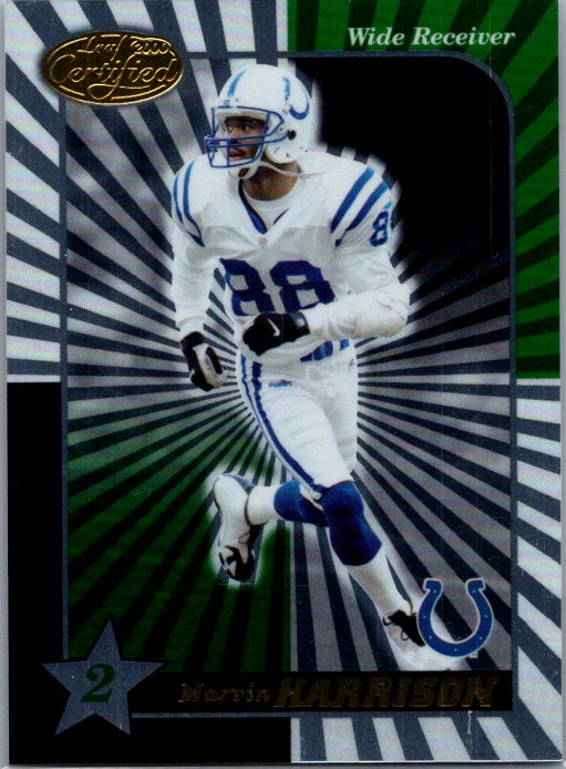 This is a really nice example of a 2000 Leaf Certified #123 Marvin Harrison .