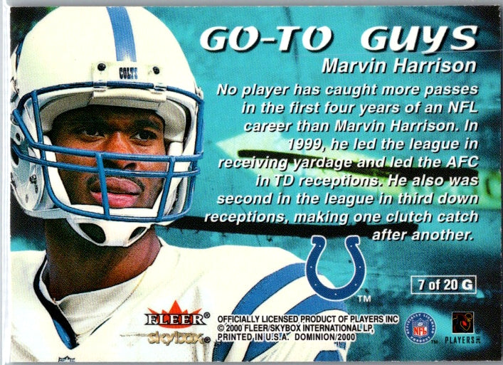 This is a really nice example of a 2000 SkyBox Dominion #7 G Marvin Harrison Go-To Guys.