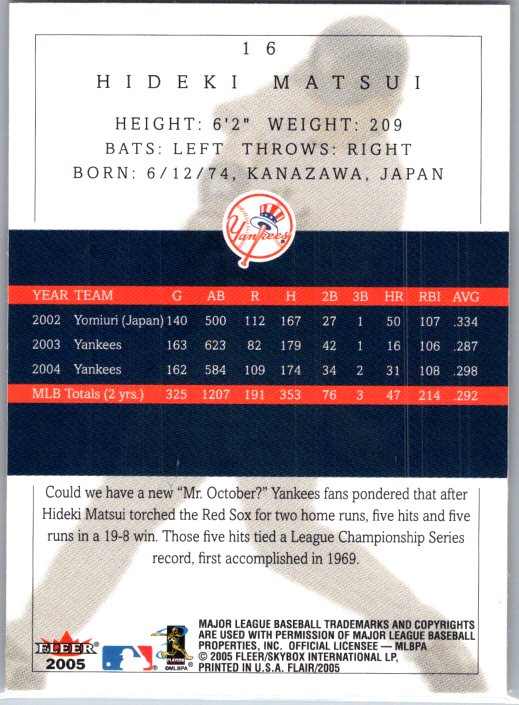 This is a really nice example of a 2005 Flair #16 Hideki Matsui .