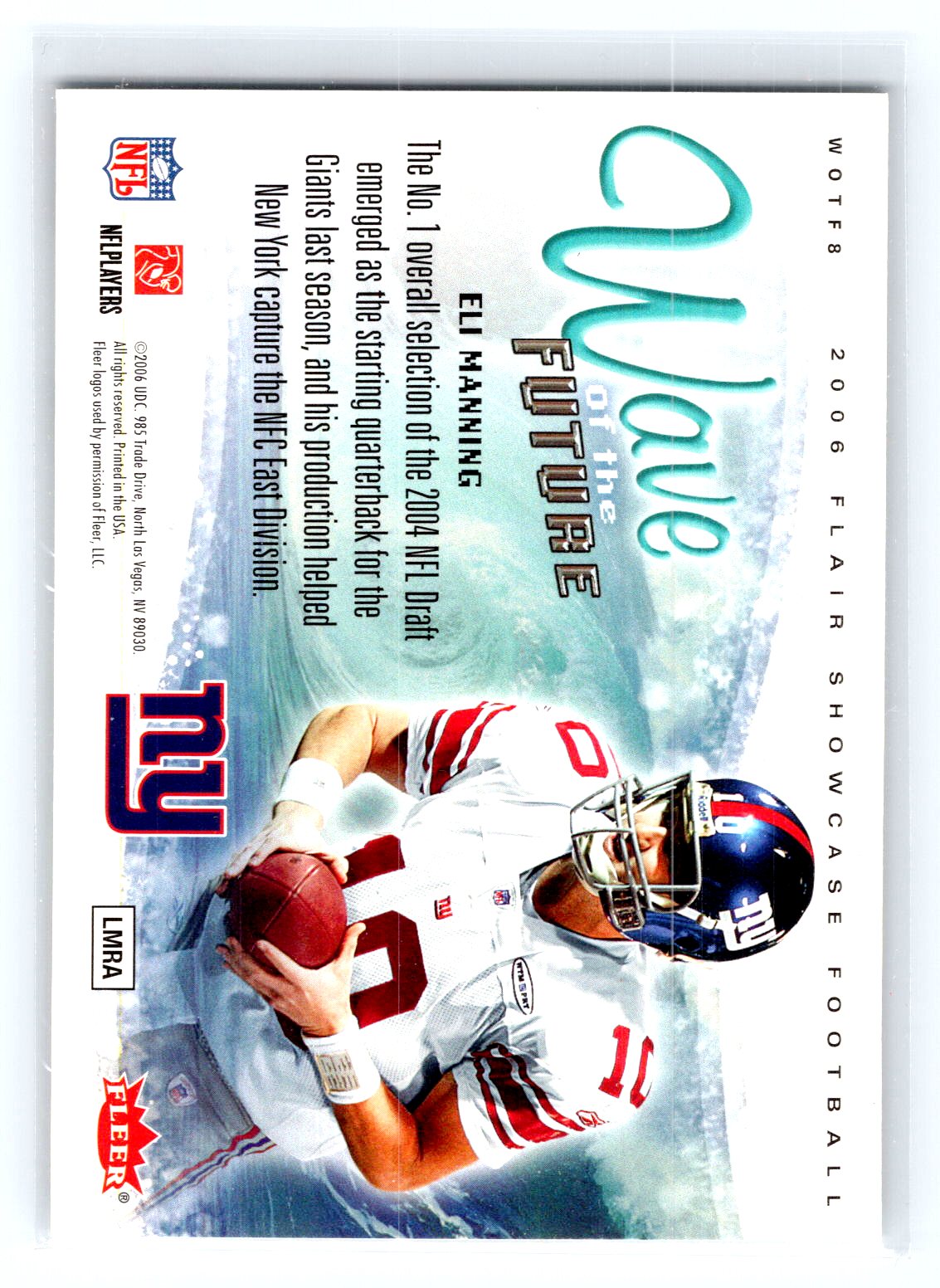 This is a really nice example of a 2006 Flair Showcase #WOTF8 Eli Manning Wave of the Future.