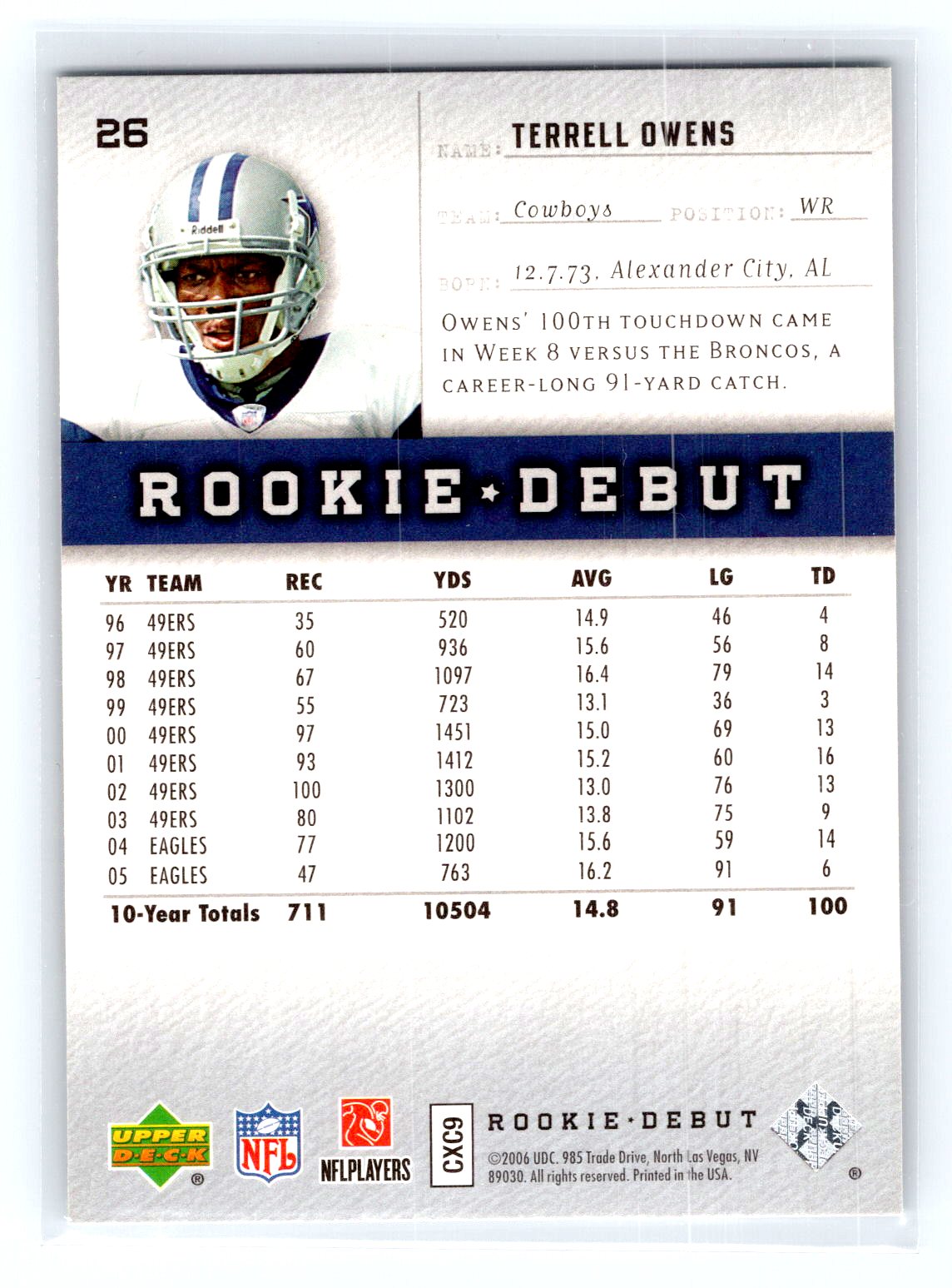 This is a really nice example of a 2006 Upper Deck Rookie Debut #26 Terrell Owens .