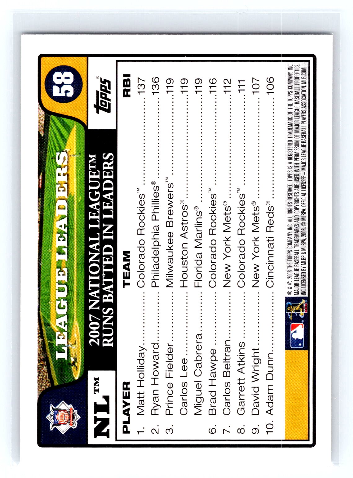 2008 Topps #58 NL Leaders: Runs Batted In (Matt Holliday / Ryan Howard / Miguel Cabrera)