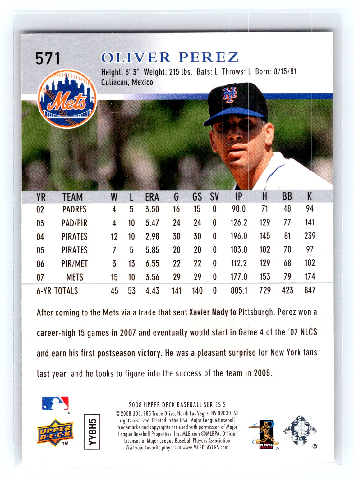 This is a really nice example of a 2008 Upper Deck #571 Oliver Perez .