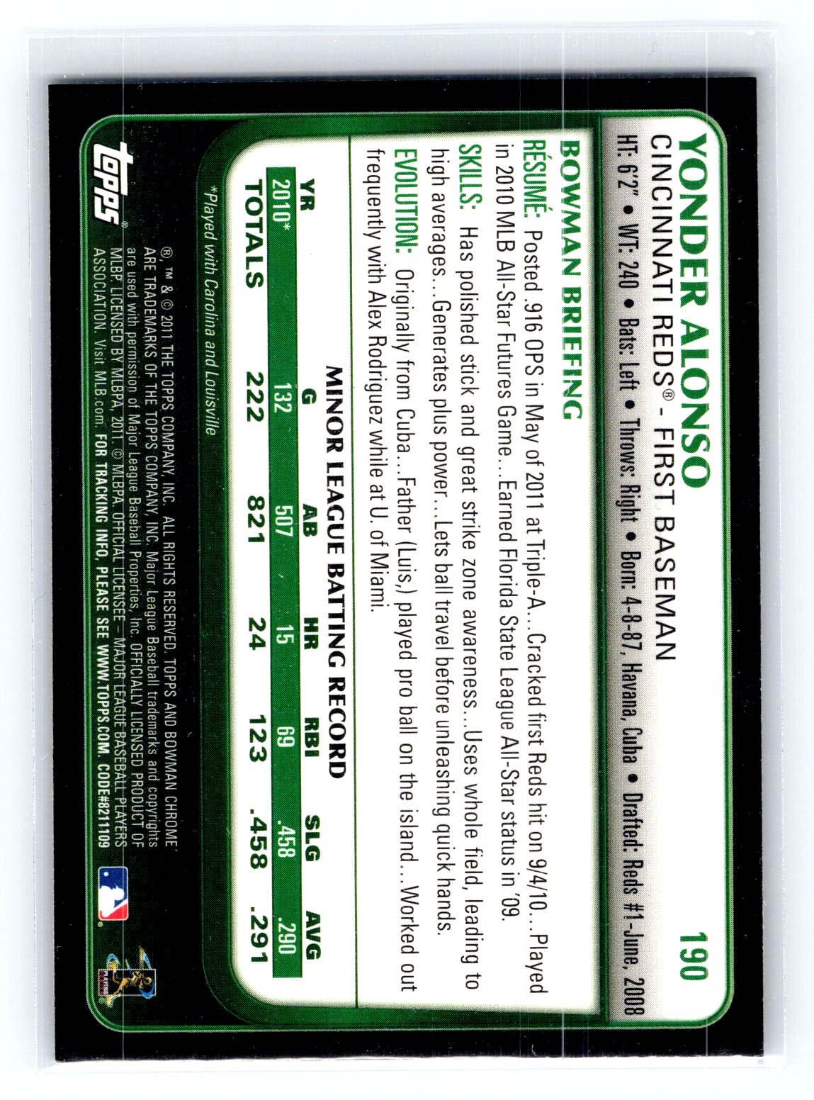 This is a really nice example of a 2011 Bowman Chrome #190 Yonder Alonso .