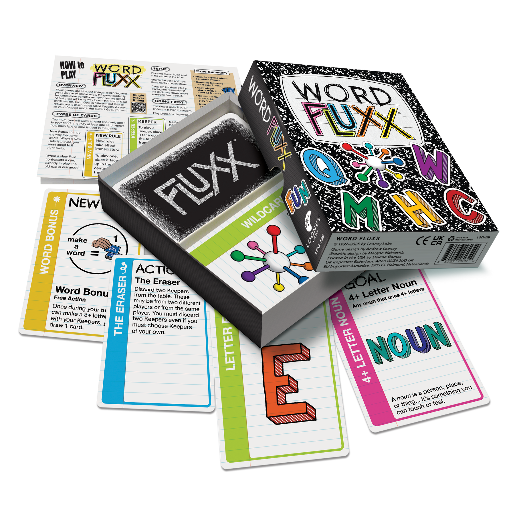 Have you heard the word? The alphabet is now in Fluxx! In this word-building version of the ever-changing card game, the Keepers each feature a letter, and the Goals involve making words of various types. With twice the typical number of Keepers, you’ll have plenty of letters to build nouns and verbs, palindromes, three-letter acronyms (TLAs), Roman numerals, and more! Word Fluxx spells F-U-N! (67 words)